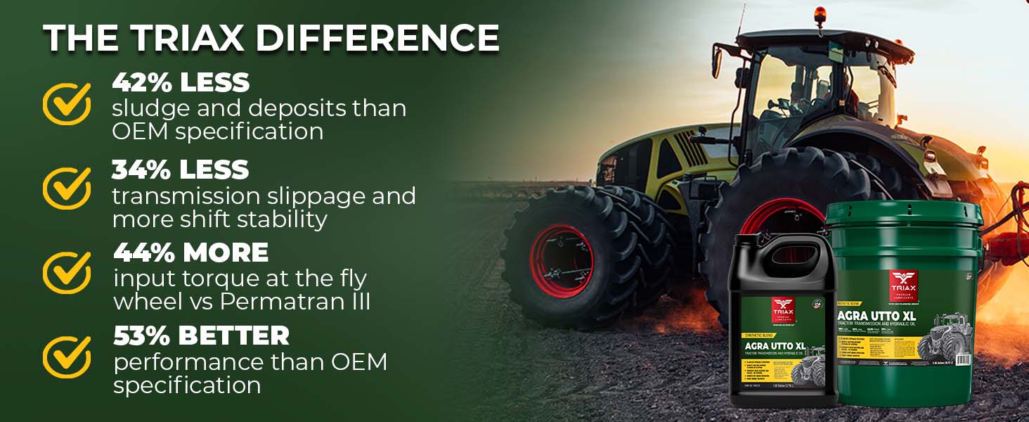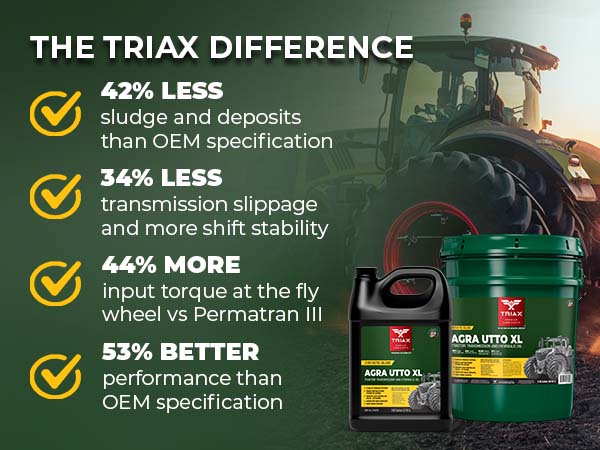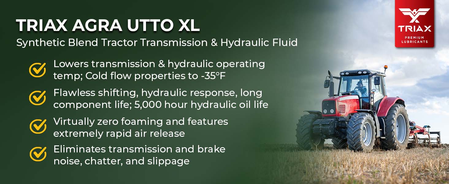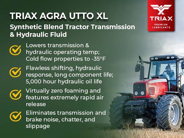 TRIAX Agra UTTO Tractor Hydraulic Fluid is an synthetic blend UTTO premium grade especially formulated for use in transmissions, final drives, wet brakes, differentials and hydraulic systems of farm tractors and construction equipment that use a common fluid reservoir that call for a combination lubricant and power transmission fluid (UTTO). TRIAX Agra meets the needs of all modern tractors for high performance combination lubricant. These fluids perform many functions such as lubrication of the transmission and final drive, as well as serving as hydraulic fluid for the operation of power steering units, brakes, implements, and equipment attachments. TRIAX Agra UTTO XL Tractor Hydraulic Fluid features exceptional extreme pressure (EP) and anti-wear performance, protects tractor transmissions, axles and hydraulic pumps.