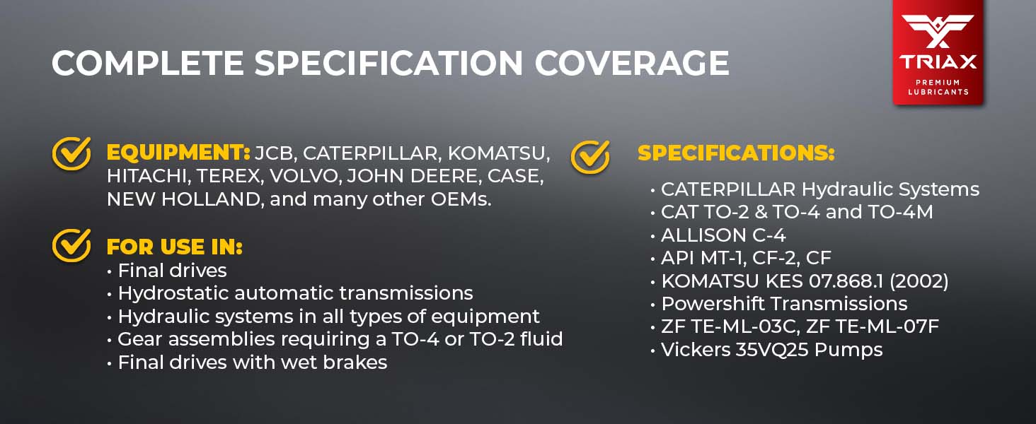 TRIAX ATLAS TRANSFLUID TO-4 are high are high performance transmission, hydraulic and drive-train lubricant designed to meet the requirements of Caterpillar’s TO-4 specifications. TRIAX ATLAS TRANSFLUID TO-4 is engineered to optimize the performance transmissions, hydraulic systems and wet clutch systems. It contains an advanced additive system to deliver the precise performance parameters needed to maximize the productivity of construction, quarrying, and mining equipment operating in severe conditions. This fluid is also recommended use in Powershift Hydrostatic transmissions and drive train from Caterpillar, Komatsu, Hitachi, JCB and a wide range of construction equipment manufacturers. TRIAX ATLAS TRANSFLUID TO-4 lubricants feature a very wide range seal compatiblity, preventing seal cracking and thermal degradation.