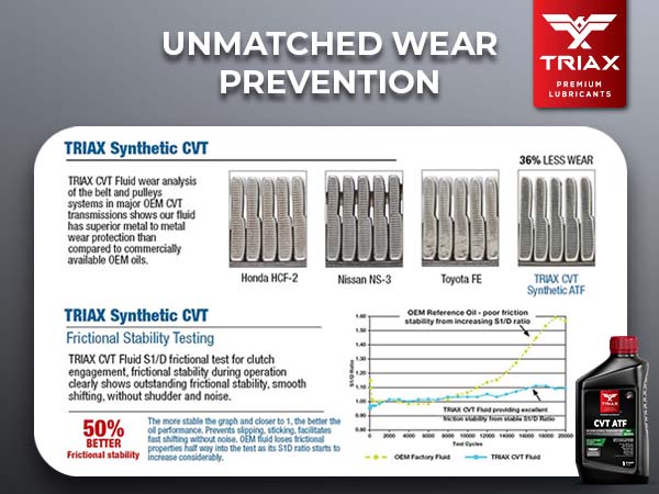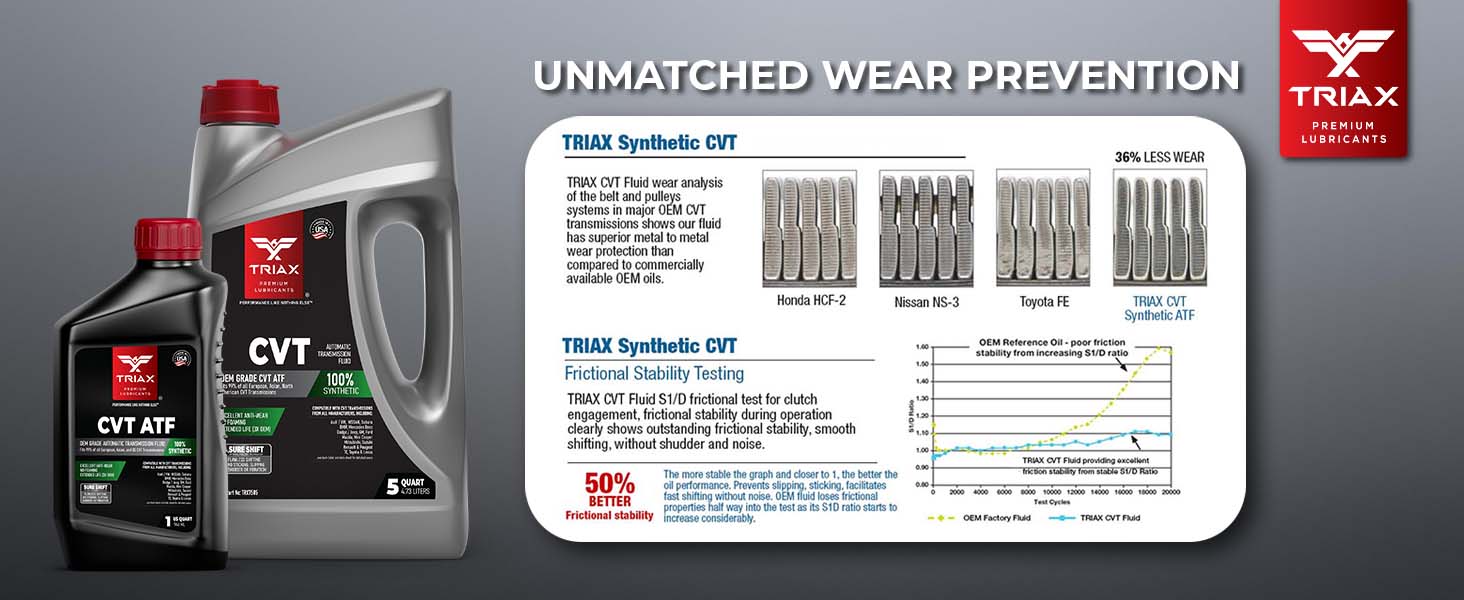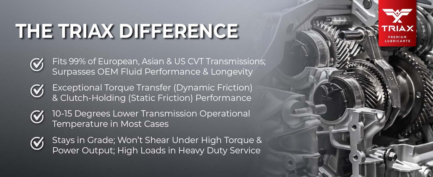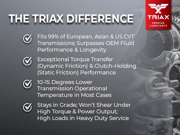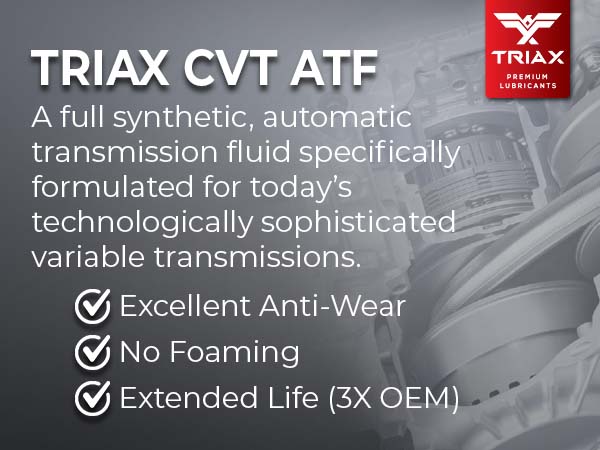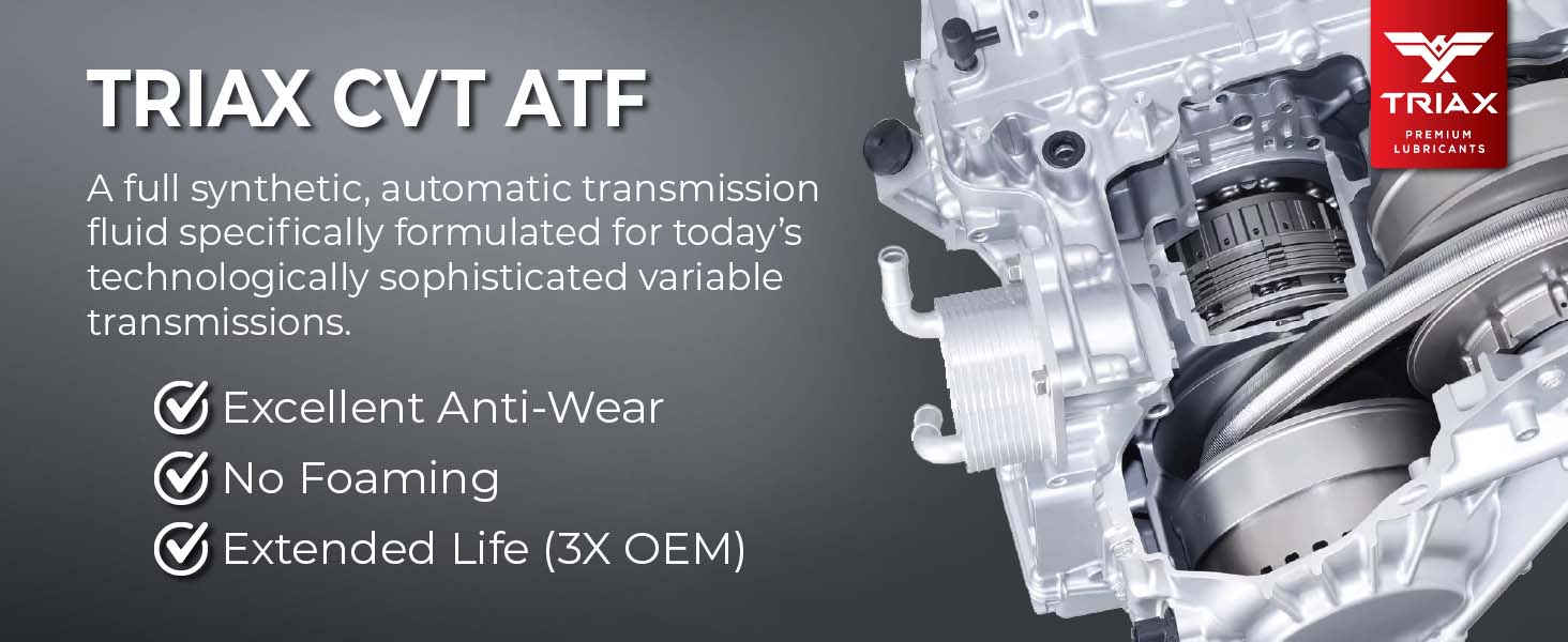 TRIAX CVT ATF Full Synthetic fluids provide superior performance to most OEM factory fluids and are fully warrantied for both new car dealership service as well as out of warranty vehicle service.