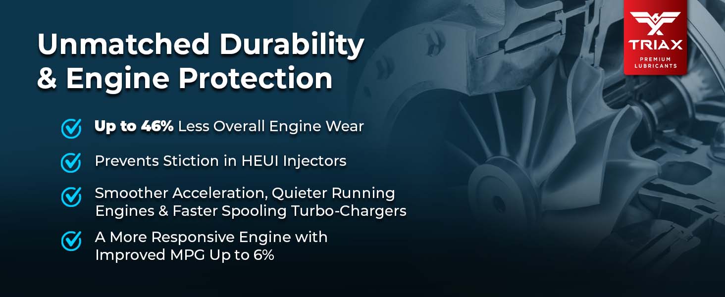 TRIAX Fleet Supreme oils are known for eliminating injector stiction in HEUI oil pressure injectors, quiet engine operation, significantly improved fuel economy and extreme drain intervals.