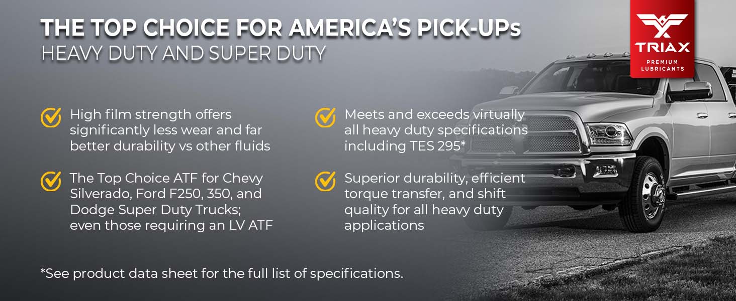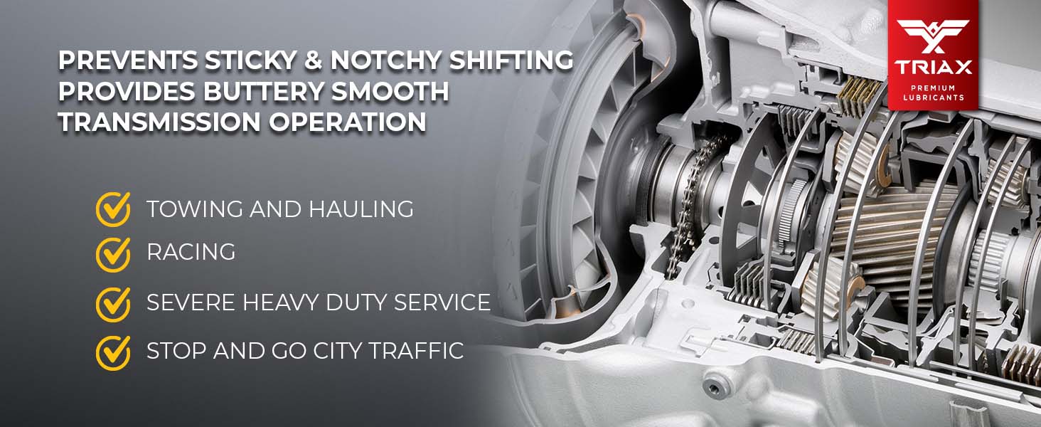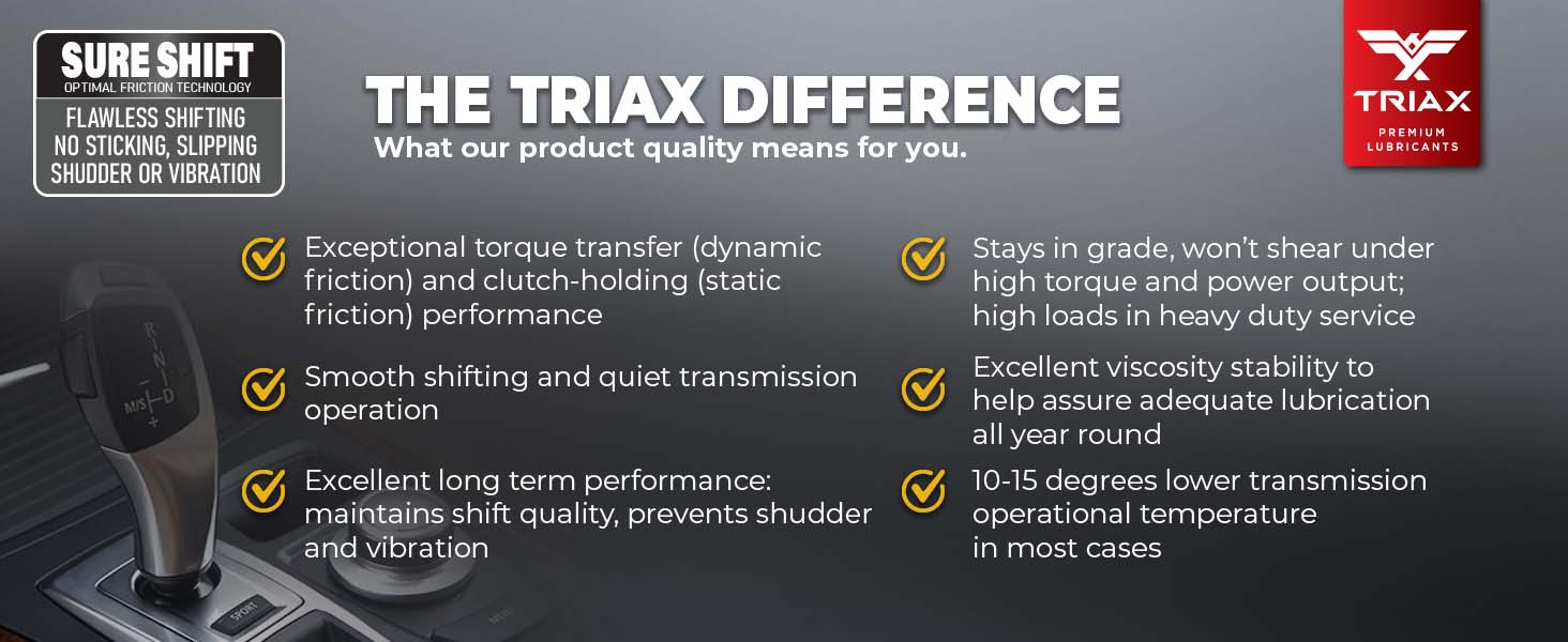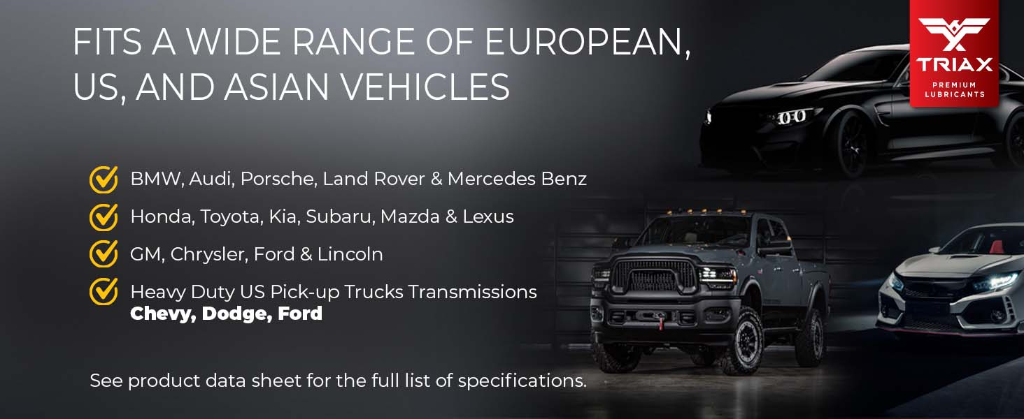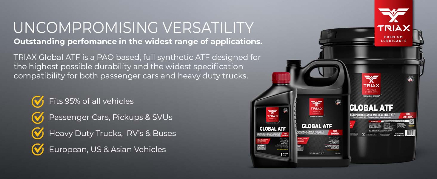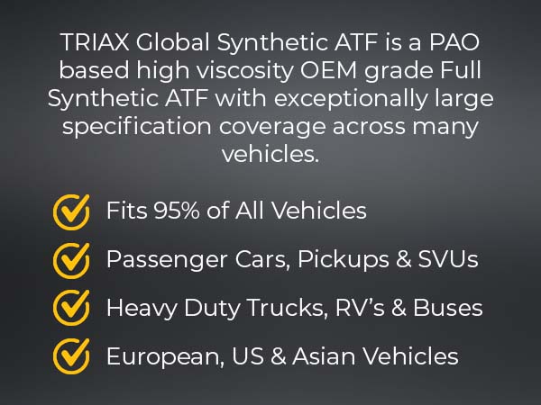 TRIAX Global ATF Synthetic one of the most advanced transmission fluids available on the market. It's a very robust formulation designed for maximum performance in 98% of all automatic transmissions of North American, European, and Asia-Pacific-made vehicles. The product is designed to provide exceptional oxidation, wear, frictional stability, sludge and deposit prevention, and anti-shudder properties required in today’s high performance transmissions. It is also designed to deliver excellent performance in older transmissions, far superior to older spec fluids.