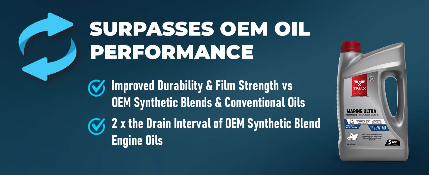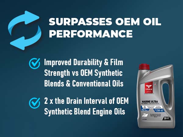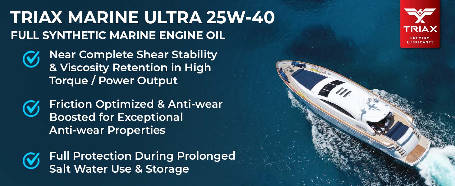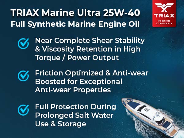 TRIAX Marine Ultra is a top tier, full synthetic, marine engine oil designed for gasoline powered marine engines. It is built with high performance synthetic base oils and custom modified additive package for outstanding long term engine protection and fuel economy. It contains a friction modifier package plus a state-of-the-art corrosion and rust inhibitor. It actively protects your water-craft engine during periods of intense activity as well as through long storage periods.