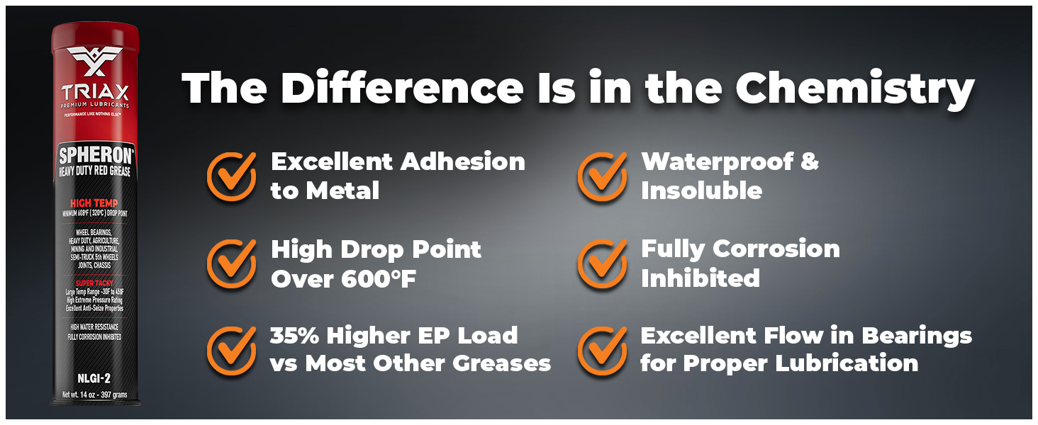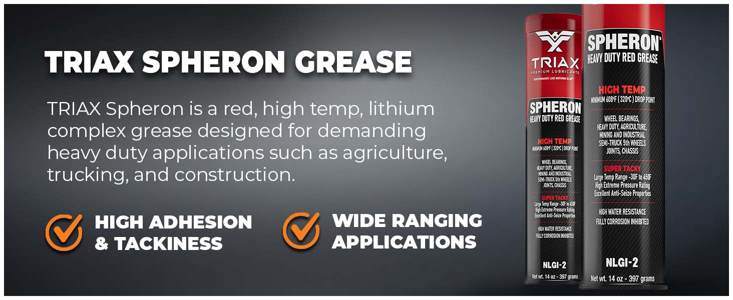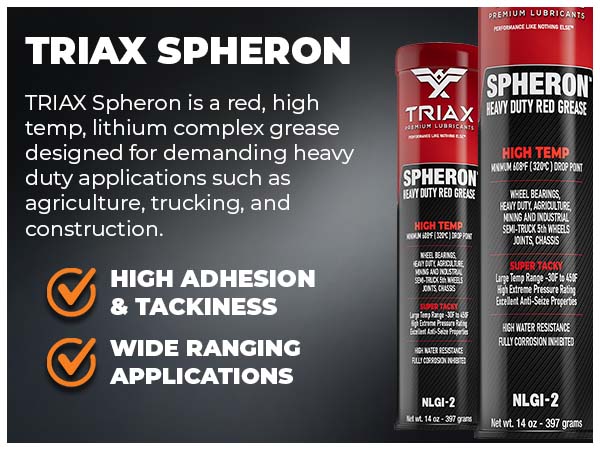 TRIAX Spheron is a high temp, premium, heavy duty, EP multi-purpose grease fortified with polymers, anti-wear agents, tackiness additives, high viscosity base oils plus rust and oxidation inhibitors. This grease is designed to “stay in place” under the most severe operating conditions found in industrial and automotive service. It is unsurpassed in resisting water wash out and protecting against wear in shock loading applications. TRIAX Spheron HT (High Temp) Grease is the grease designed to “stay there and lubricate” under the worst conditions of water-dirt-mud. Excellent adhesion guarantees the product will perform well in the most severe applications in agriculture, mining, quarrying, heavy duty trucking or just when you want the best possible performance from your grease.