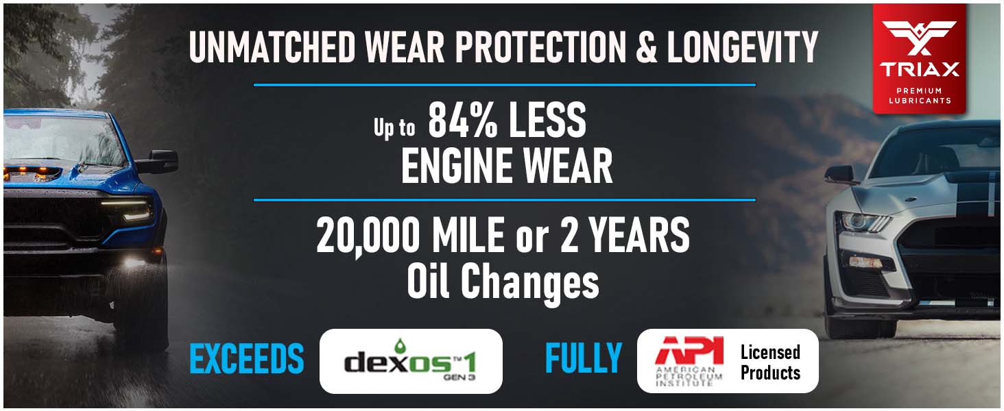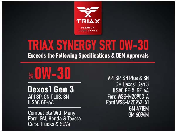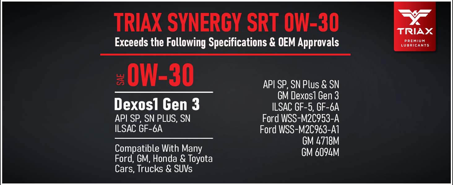 TRIAX Synergy SRT engine oils contain our CRP Technology with Molybdenum and Boron boosters, and High Phosphate Retention ZDDP for outstanding wear and friction reduction for overall excellent performance. These products exceed the latest requirements from a wide range of manufacturers such as Ford, Honda, Opel and General Motors Dexos 1 Gen 2® engine oil specifications and include many tests which are not included in current industry standards.