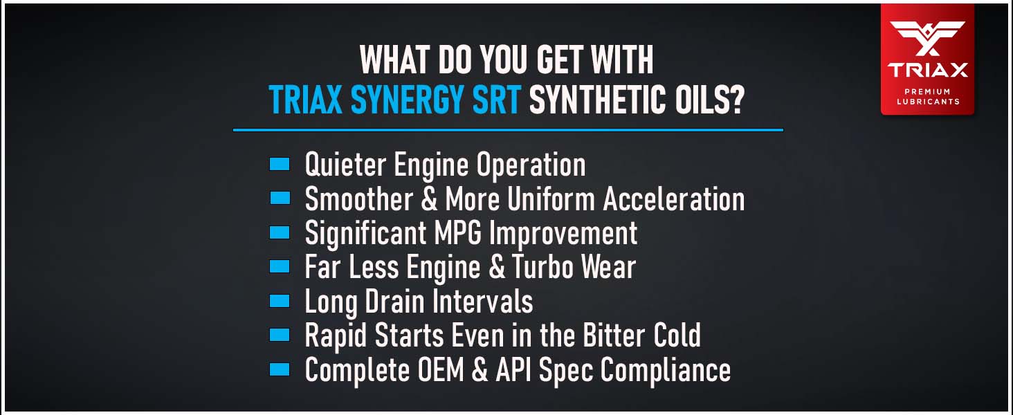 TRIAX Synergy SRT Performance engine oils are state-of-the-art high performance full synthetic engine oils, designed to provide outstanding performance and protection in all driving conditions and tailored to meet even the highest expectations from professional mechanics and consumers alike. These oils are formulated with 100% synthetic base oils, group IV PAO and Esters stabilizer and have been heavily boosted to deliver substantially higher performance than 99% of lubricants available on the market today.