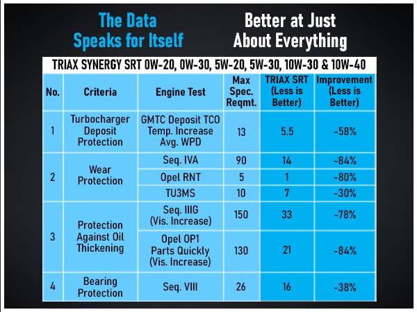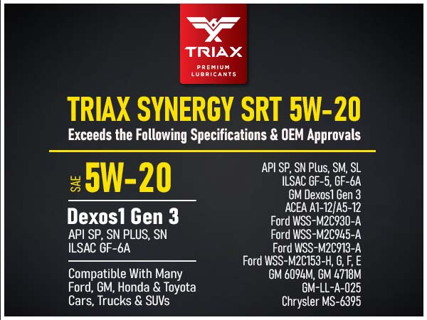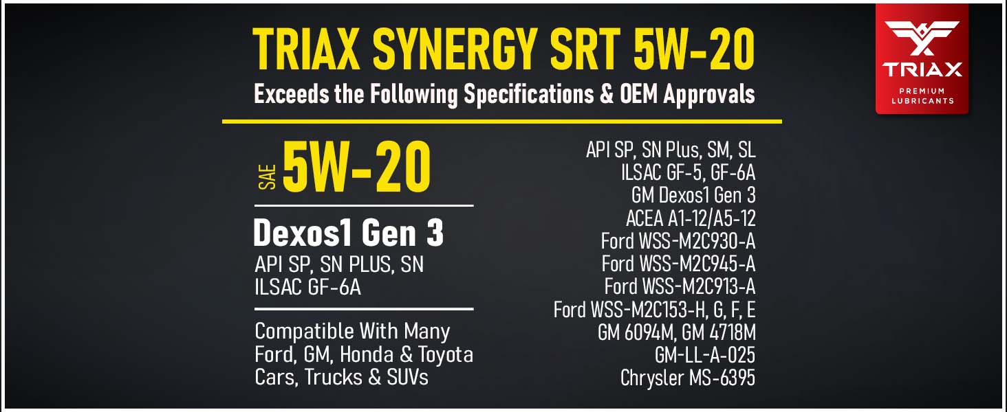 TRIAX Synergy SRT Performance engine oils are state-of-the-art high performance full synthetic engine oils, designed to provide outstanding performance and protection in all driving conditions and tailored to meet even the highest expectations from professional mechanics and consumers alike. These oils are formulated with 100% synthetic base oils, group IV PAO and Esters stabilizer and have been heavily boosted to deliver substantially higher performance than 99% of lubricants available on the market today. TRIAX Synergy SRT engine oils contain our CRP Technology with Molybdenum and Boron boosters, and High Phosphate Retention ZDDP for outstanding wear and friction reduction for overall excellent performance. These products exceed the latest requirements from a wide range of manufacturers such as Ford, Honda, Opel and General Motors Dexos 1 Gen 2 ® engine oil specifications and include many tests which are not included in current industry standards.
